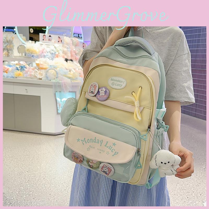 Simple Color Blocked Letter Pattern Student Backpack With Badge And Pendant For Teen School Bag