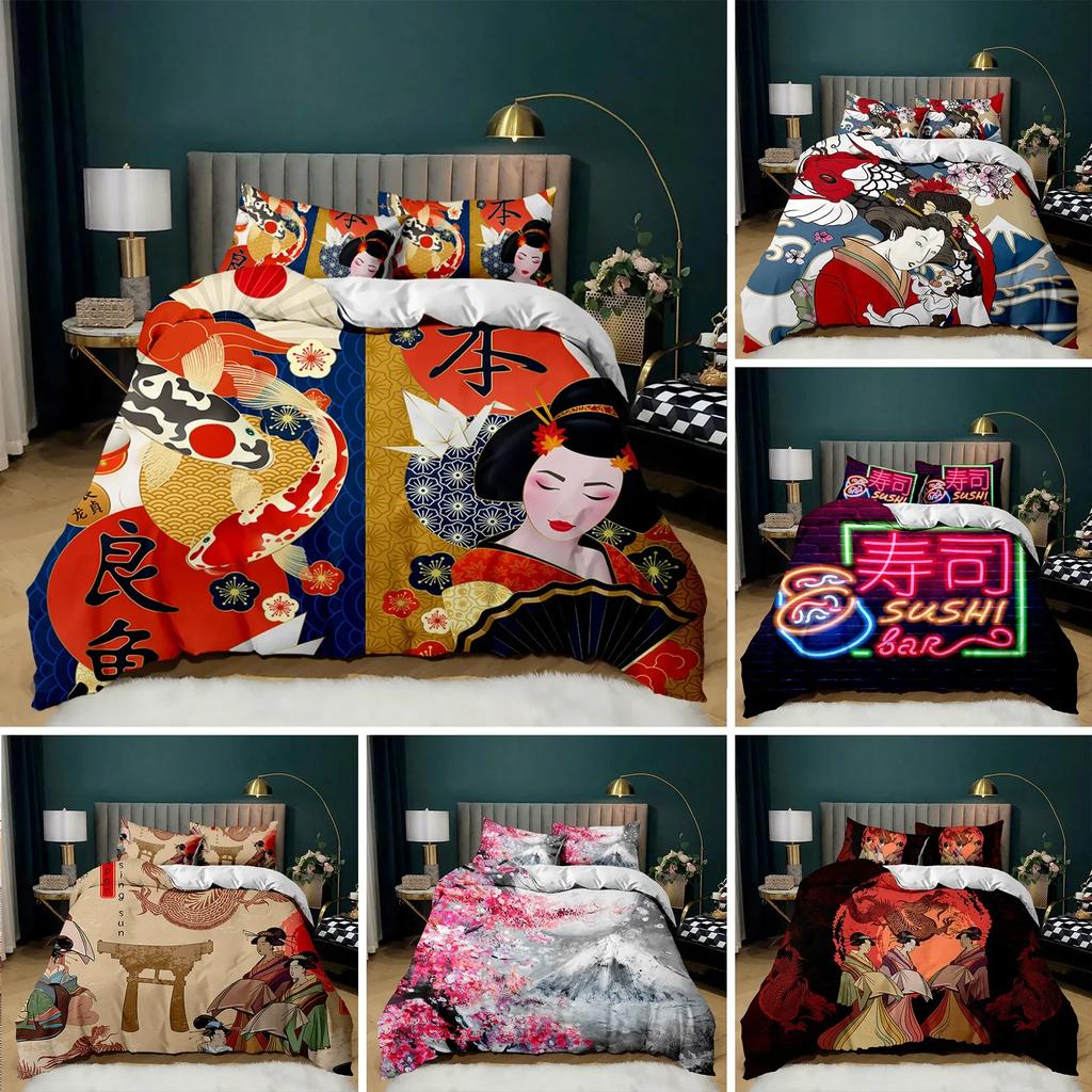 Bettbezug-Set mit japanischen Elementen, Geisha, japanisches Kulturthema, Doppelbett-Bettwäscheset, Queen-Size-Bett, King-Size-Bett, Polyester, Bettbezug