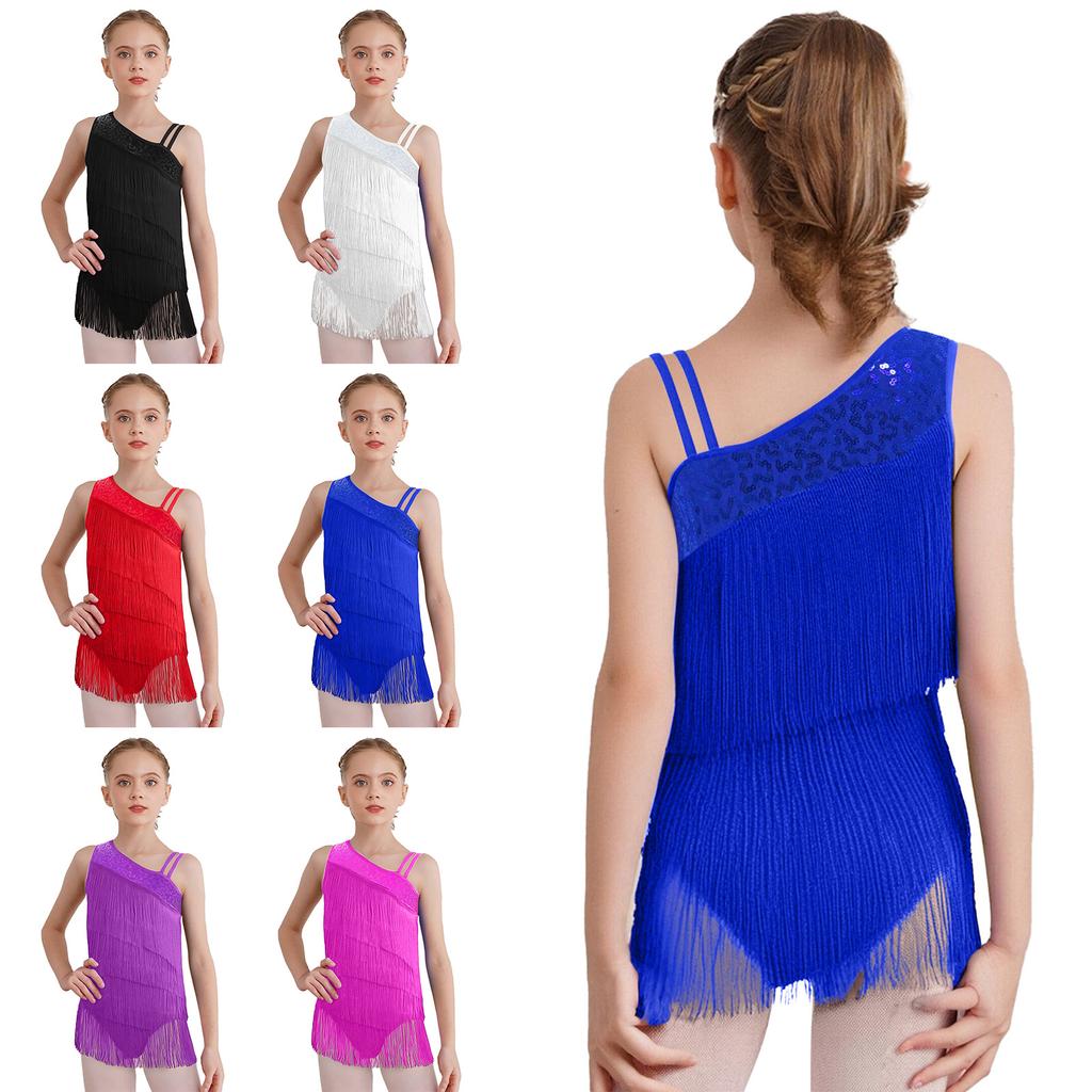 Mädchen Modernes Standardtanzkostüm Ärmellos Stufige Quasten Body Asymmetrisches Design Latein Salsa Tanzbekleidung