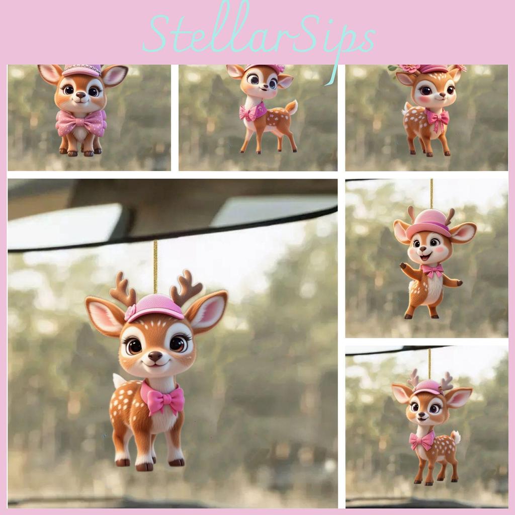 Auto Deko Acryl Cartoon Hirsch Spiegel Ornament Mit Rosa Hut Und Schleife Für Kinder Auto Innenraum