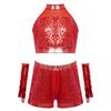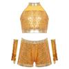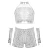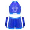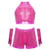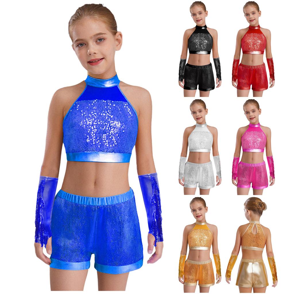 Mädchen Ärmelloses Glitzerndes Pailletten Tanz Crop Top Schlüsselloch Rücken Design Passende Shorts Quasten Metallic Handschuhe Set