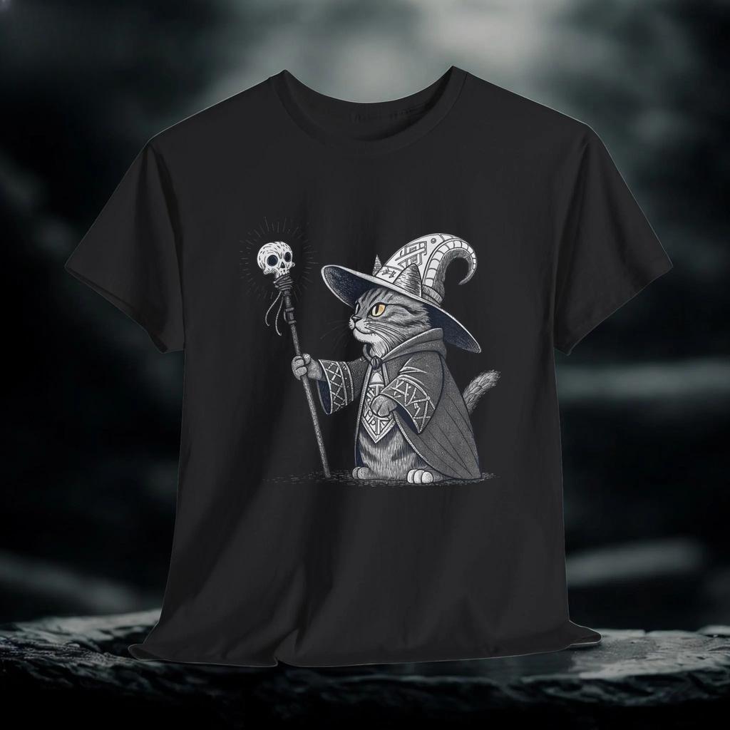 Nekromanten Kätzchen T-Shirt, Gothic Katze Grafik T-Shirt, Mythisches Fantasy Unisex Oberteil, Mittelalterliches Lustiges Shirt, Handgezeichneter Tierdruck