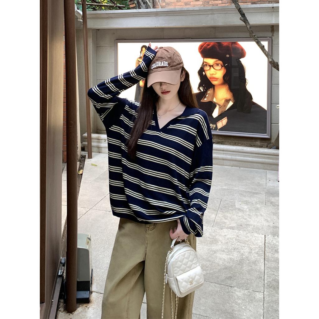 Striped polo collar soft waxy top women's spring and autumn new niche loose lazy wind loose knitted sweater