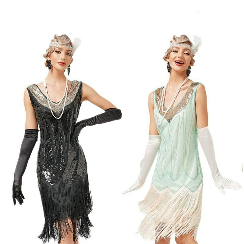 Retro 1920er Retro V-Ausschnitt Quastenrock Kostüm Lateinamerikanischer Tanz Ball Paillettenbesetztes Perlenkleid