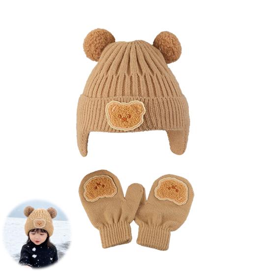 2Stk/Set Kinder Hut Handschuhe Set Bärenohrenform Ohrenschutz Einfarbig Gestrickte Mütze Elastisches Warmes Handschuhset Winter Kopfbedeckungsset