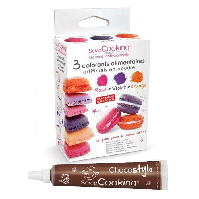 3 colorants alimentaires orange, violet, rose + 1 Stylo chocolat