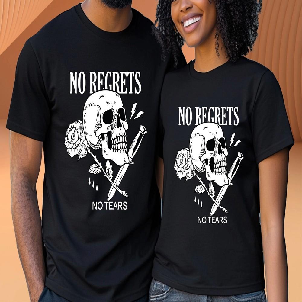 Gothic Punk T Shirt Unisex No Regrets No Tears Skull Tattoo Rose Knife Gift Tee