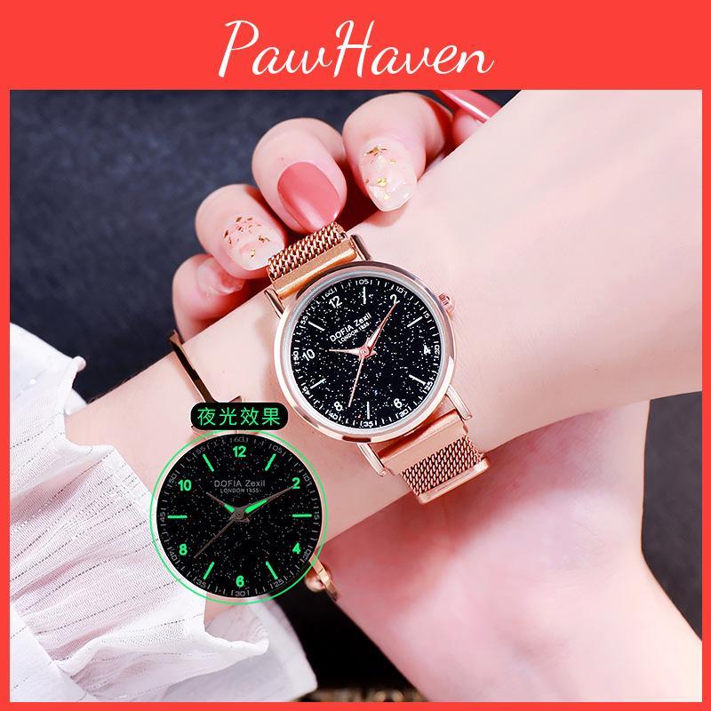 Modische Trendige Damen-Nachtlichtuhr Dekorative Quarz-Zifferblatt Lässiger Stil Roségold Sternenhimmel-Zifferblatt Nicht wasserdicht