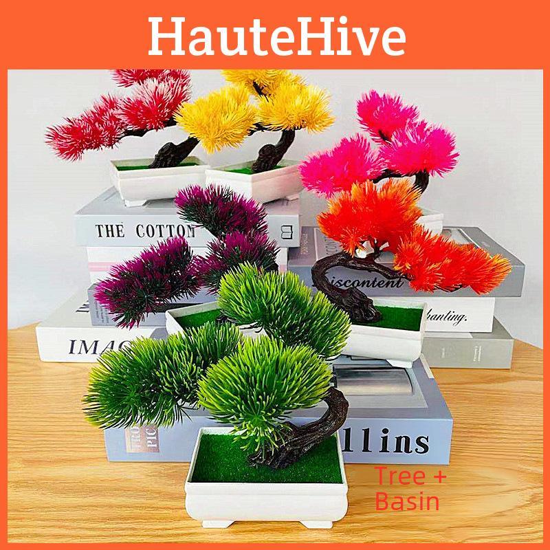 Miniatur-Bonsai-Kiefer mit künstlichen Blumen für Schreibtisch und Innenraumbegrünung