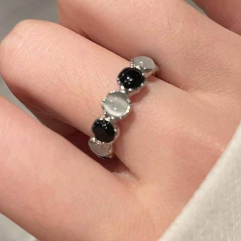 Chic Minimalist Open Finger Ring With Geometric Black And White Cat Eye Stone