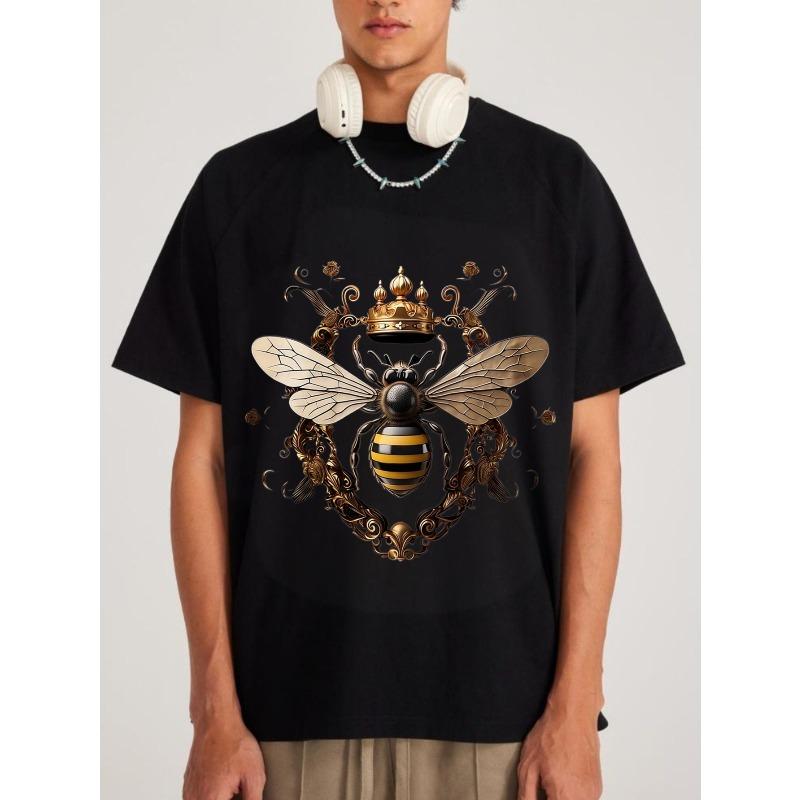 Herren Schwarzes T-Shirt Biene mit Krone und verschnörkeltem Design Grafikdruck Lässig Streetwear Mode Top