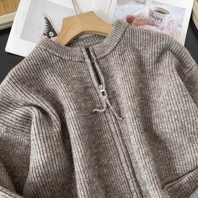 Doppelkopf-Reißverschluss Rundhals Strickjacke Top Weiche Strickjacke Pullover Damen Frühling und Herbst Neu Locker Tasche