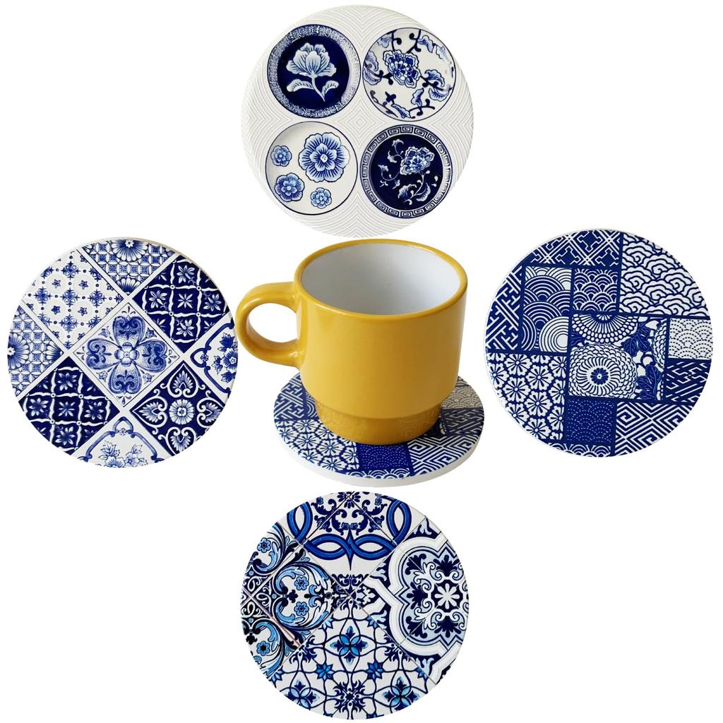 Rurumi Indigo Muster Absorbierende Keramikuntersetzer, 4er-Set, Rund, Tassenhalter, Absorbierende Glasuntersetzer (ZU)