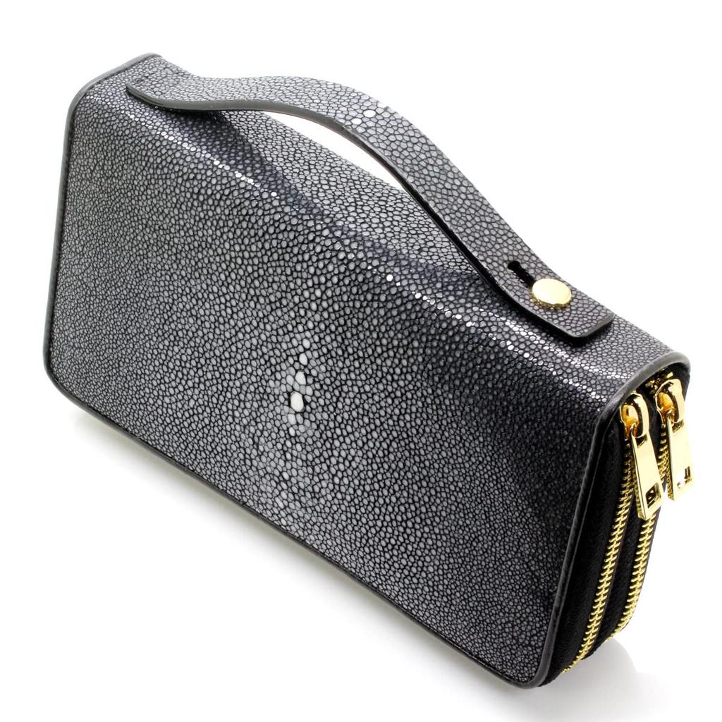 [Revetta] Stingray Leather Long Wallet, Large Capacity, Galuchat, Black, 40 Card Slots, Double Zipper Closure, Handle, Gold, Black, Men's, Genuine