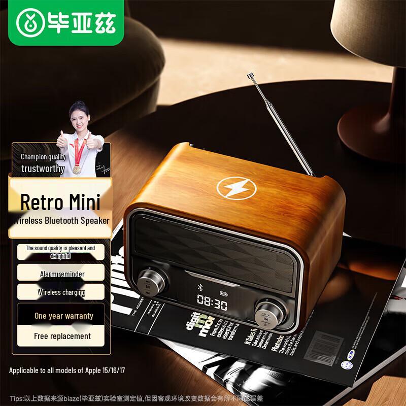 BIAZE Retro Mini Bluetooth Speaker with Radio and Wireless Charger