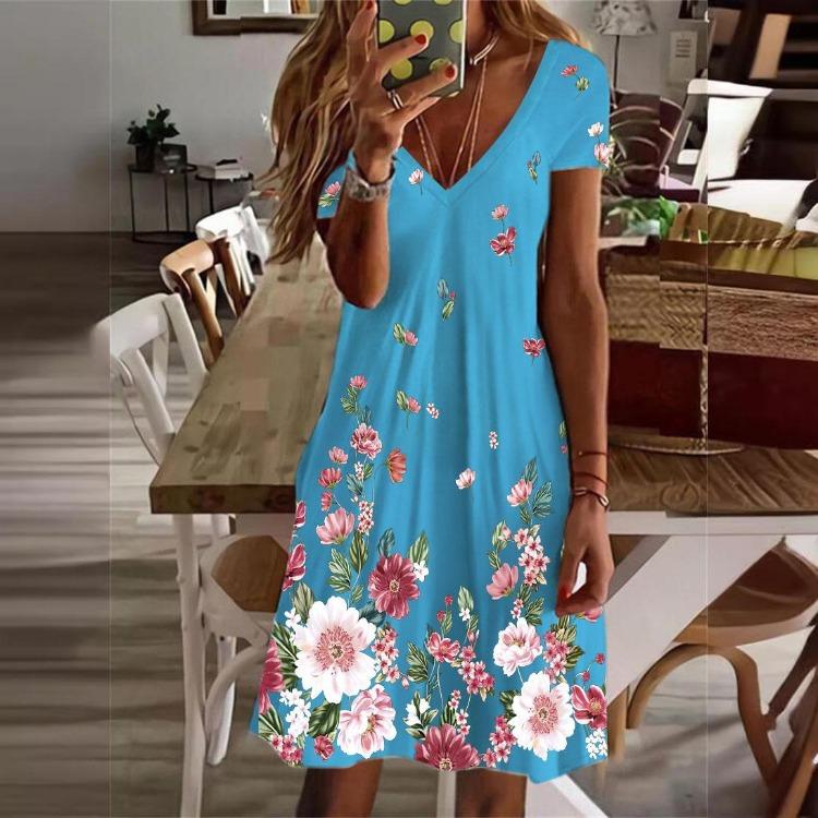 Women Summer Casual Floral Print V Neck One Piece Dress Holiday Beach Wear
