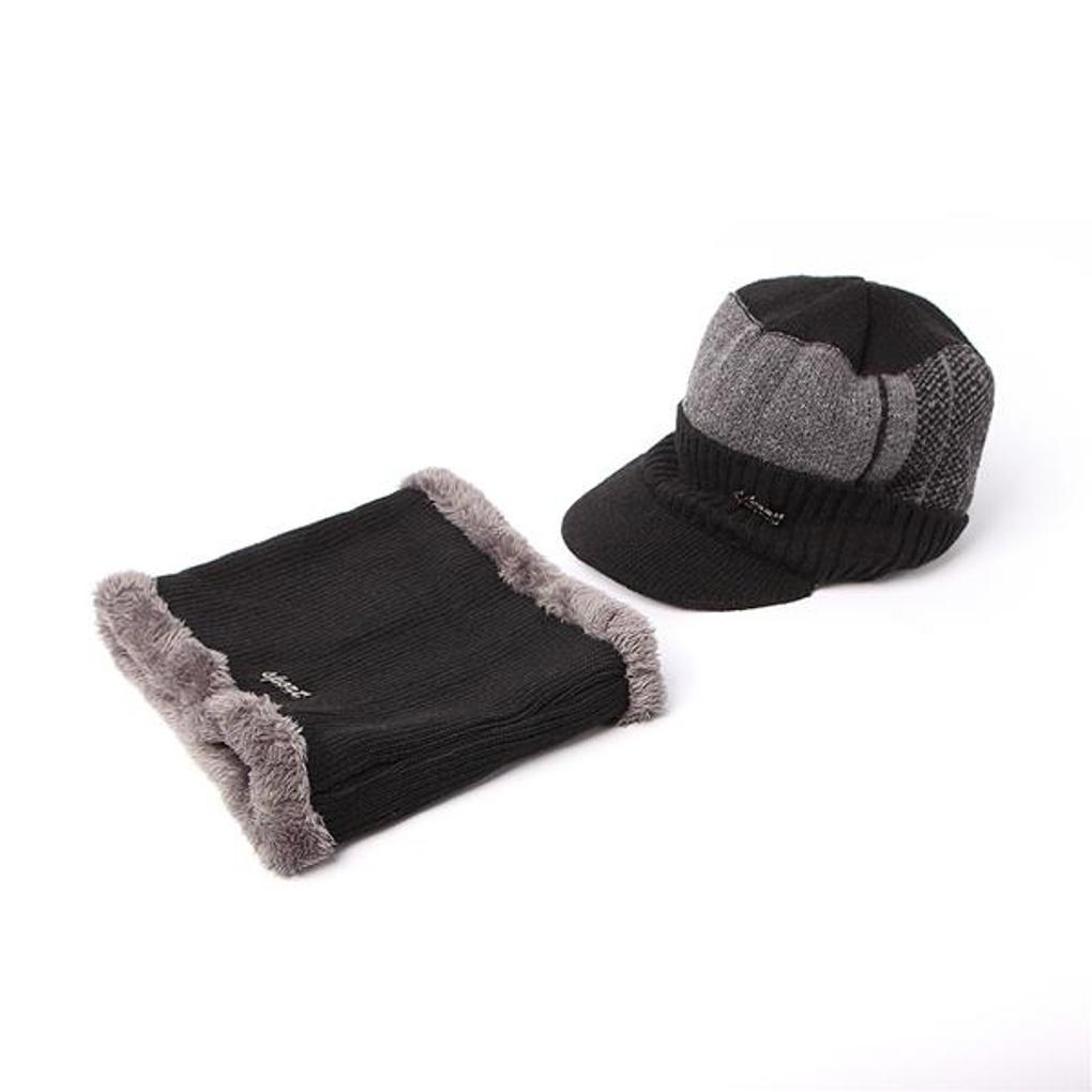 Neckwarmer Knit Brim Hat Set (Black)/Fur Hat Winter Hat