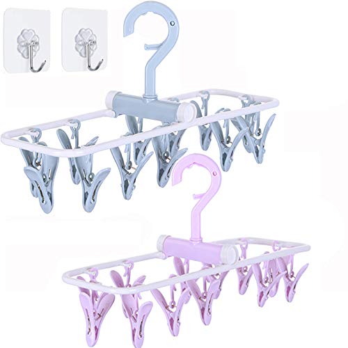 Foshine Folding Stainless Steel Clothes Drying Hanger, 2-Pack, 24 Clothes Pinch Hangers, Portable Hanger, Travel Hanger, Blue, Purple