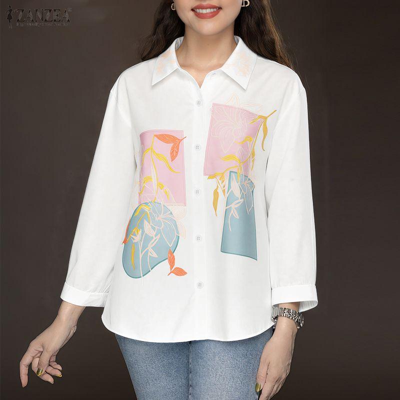 ZANZEA Damen Lässig Umlegekragen Locker 3/4 Ärmel Print Bluse
