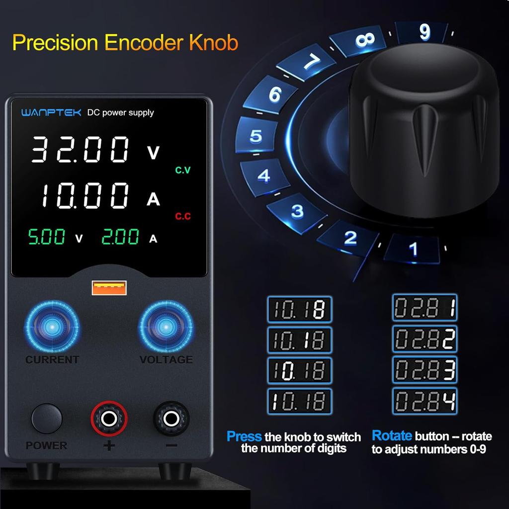 Wanptek DC Power Supply 30V 10A, Variable Bench Supply with Encoder, USB Fast Charge, 4-Digit LED Display