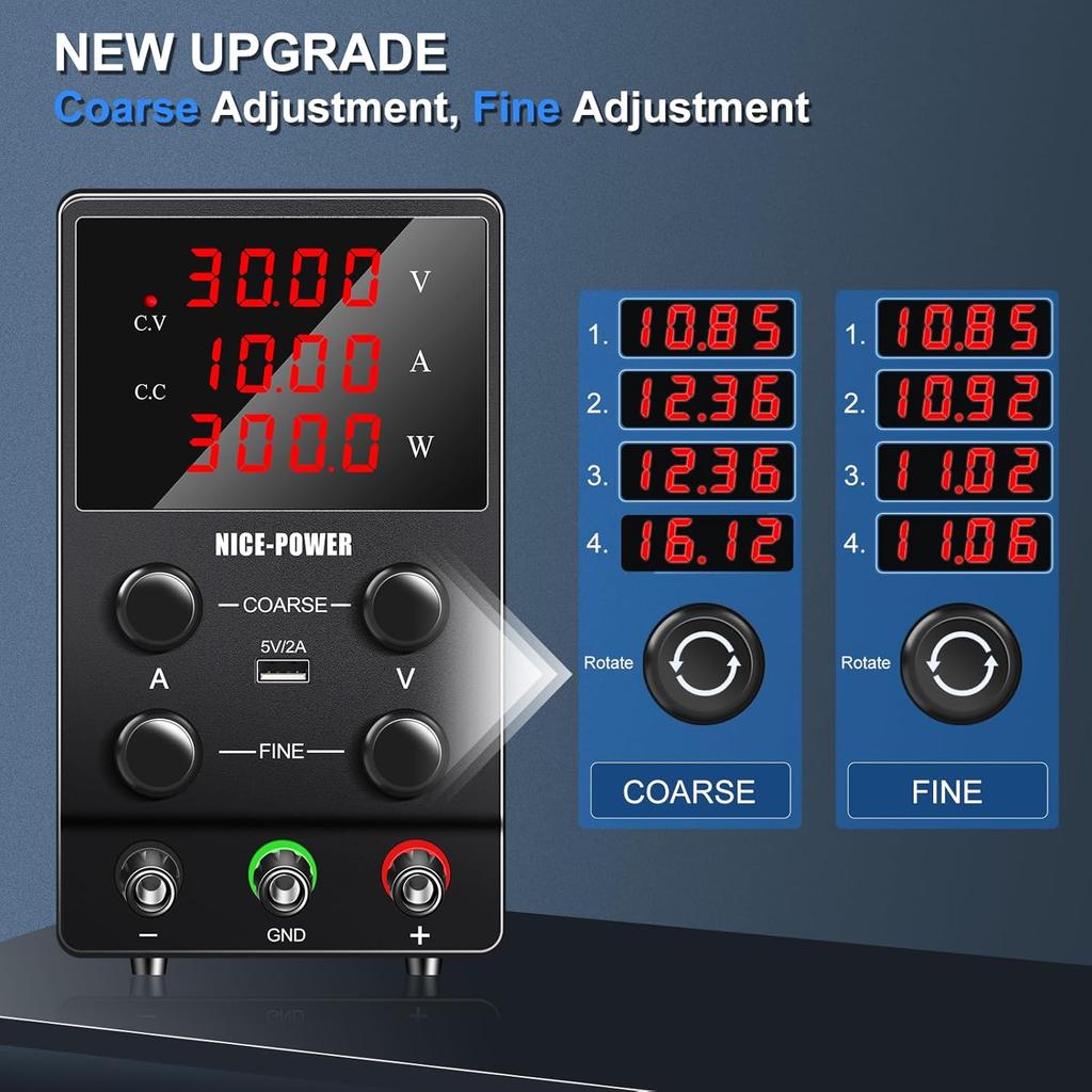 30V 10A Adjustable DC Power Supply, 4-Digit LED, 5V/2A USB, Test Leads, Bench Lab PSU
