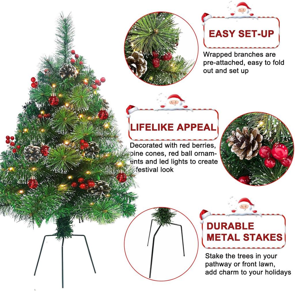 2 Pack 30' Pre-Lit Artificial Christmas Trees with Lights, Battery Operated, for Porch, Yard, Driveway, Red Ornaments