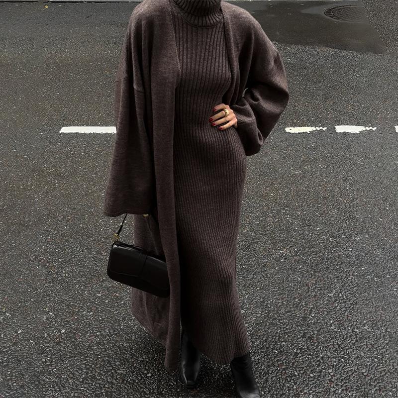 Autumn and Winter New Turtleneck Slim Fit Inside Long Skirt Cardigan Robe Jacket Sweater Set Women