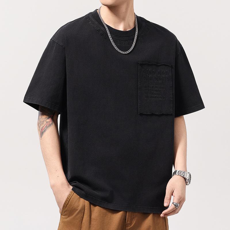 New Summer Heavy Short-sleeved T-shirt for Men Wide Embroidered Cotton Old Round Neck Top