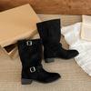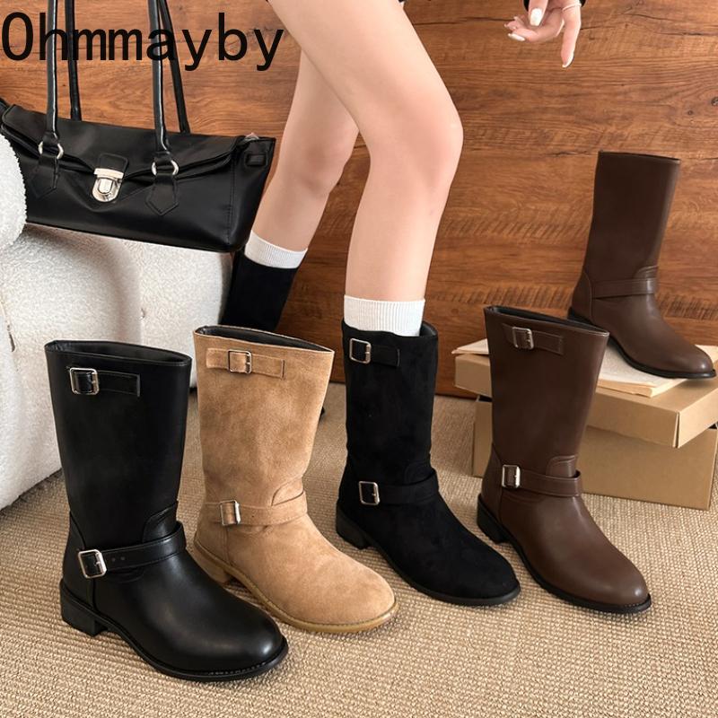 Winter Street Style Gürtelschnalle Damen Ritterstiefel Elegant Niedrig Absatz Schuhe Damen Slipper Mid-Calf Stiefeletten De Muje