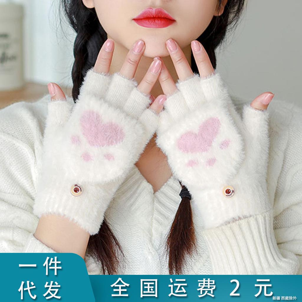 Gloves Women's winter knitted wool half-finger dual-purpose flip to keep warm Thickened versatile student Korean version imitation mink gloves