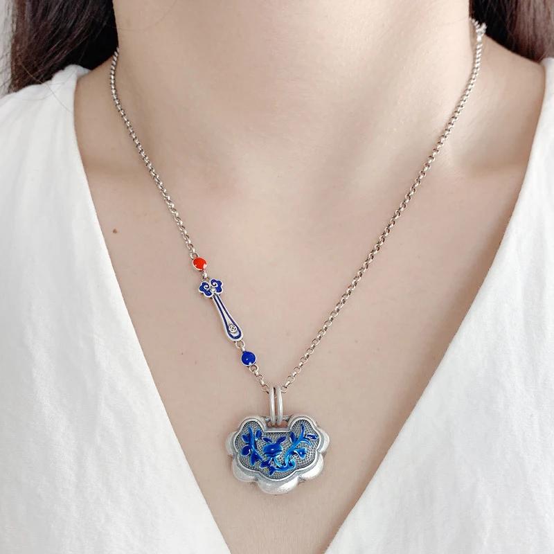 Original Faceted Blue Orchid Enamel Ruyi Necklace For Women Charms Exquisite Pendant Clavicle Chain Banquet Jewelry