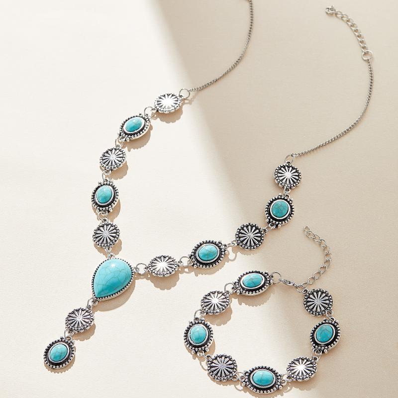 Boho Imitation Turquoise Long Pendant Necklaces Chest Chain Bracelet Set For Women Punk Cuban Link Clavicle Chain Body Jewelry