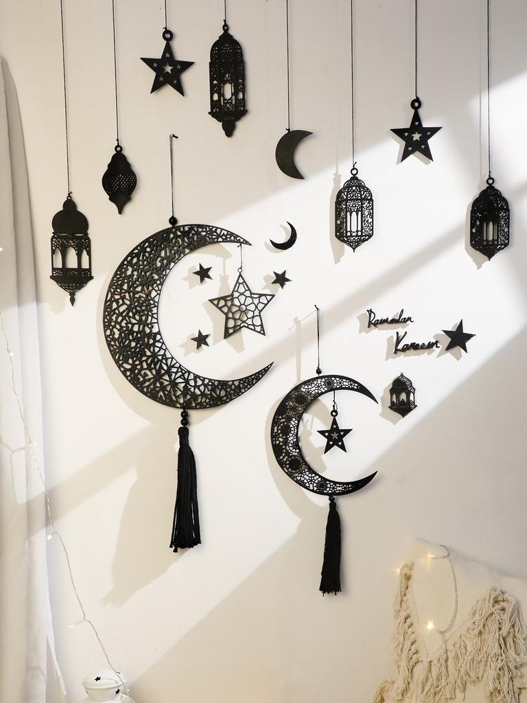 Black Wooden Hanging Lanterns Crescent Moon with Star Cutouts and Tassel, for Ramadan and Eid, Islamic Festival Home Decorations