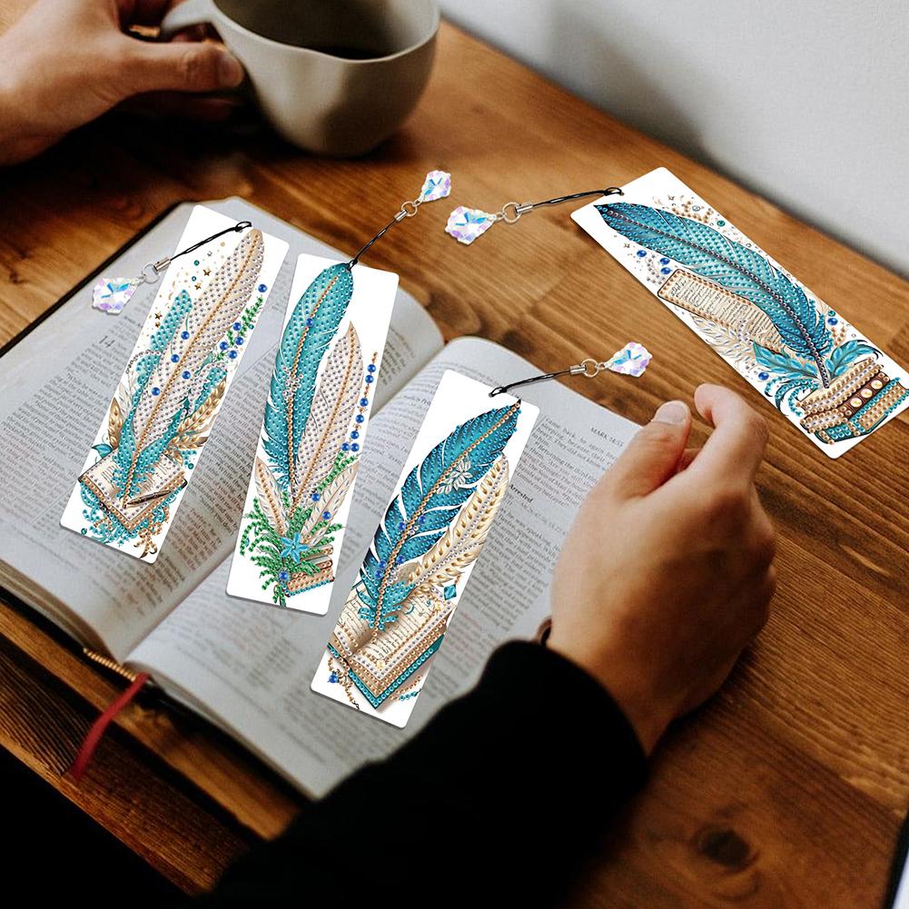 4Pcs Special Shape Beautiful Feathers 5D DIY Diamond Painting Bookmark Diamond Art Bookmark with Pendant for Reading Day Gift