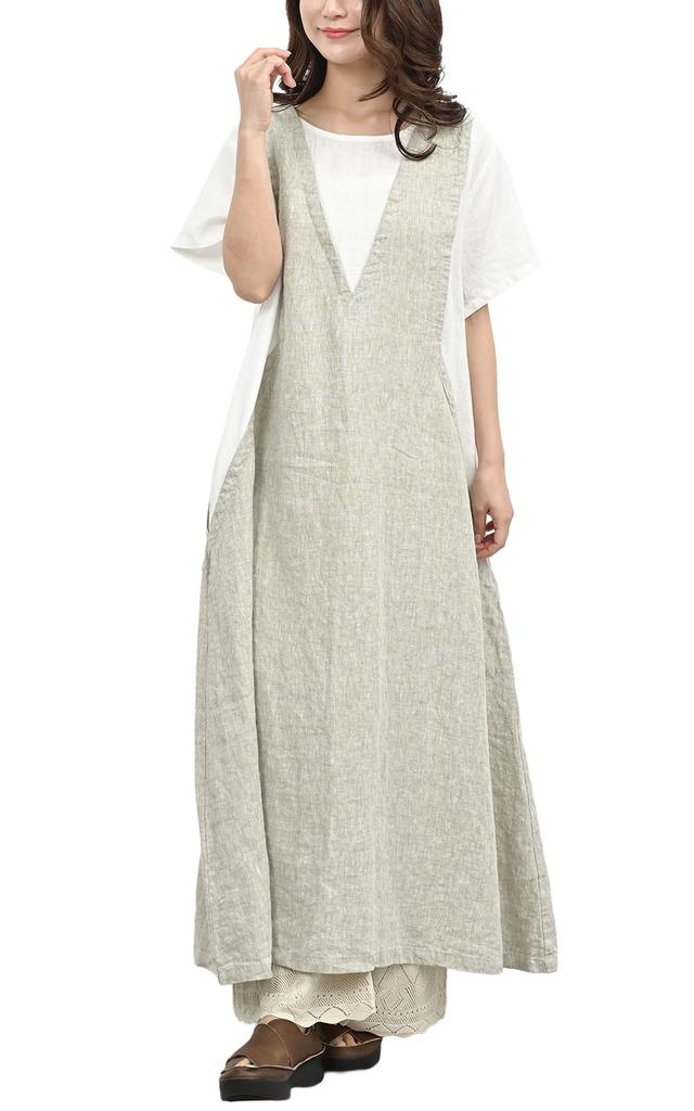 JANJAM Plus Size Women's Linen Jumper Skirt Dress, Short Sleeves, Long Length, Layered Look, 08mab Linen100, Greige x Off-White, Sizes M-3L