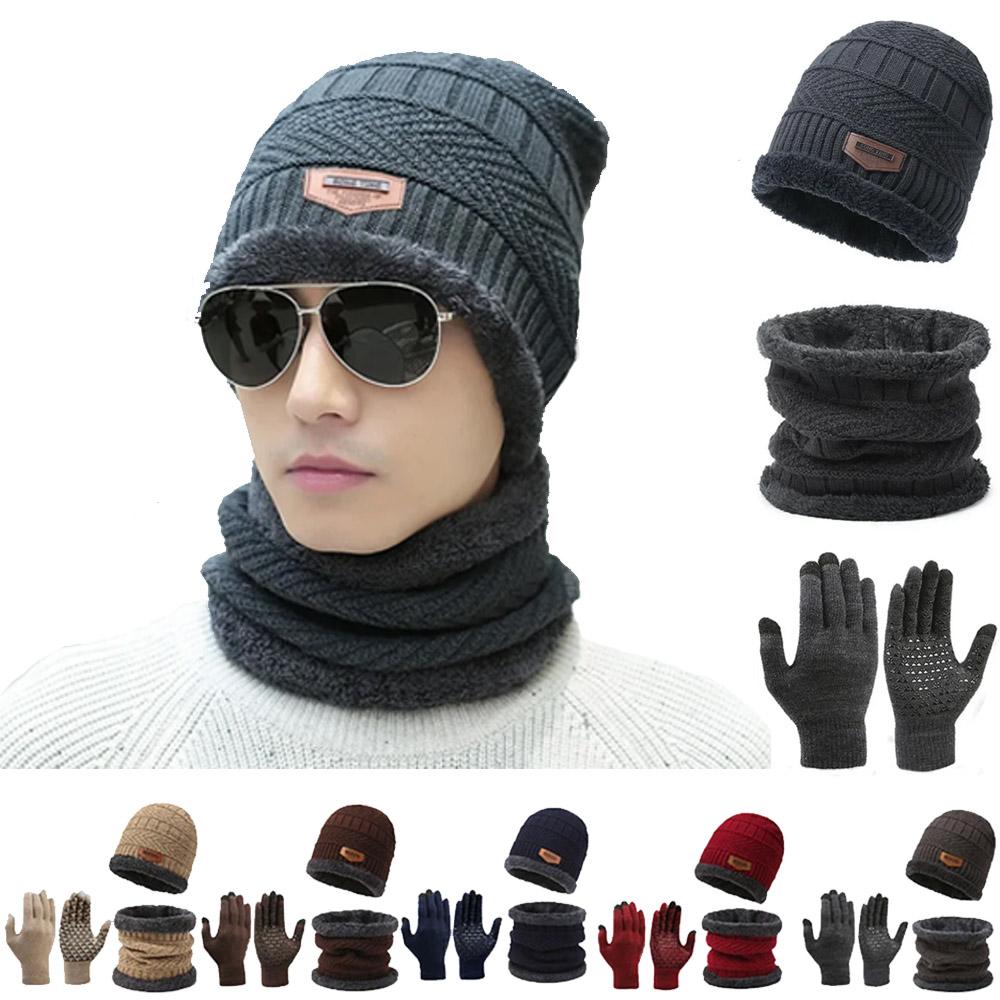 3Pcs Winter Fleece Thicken Windproof Hat Gloves Scarf Set Plush Warm Wool Knit Beanies for Men And Women