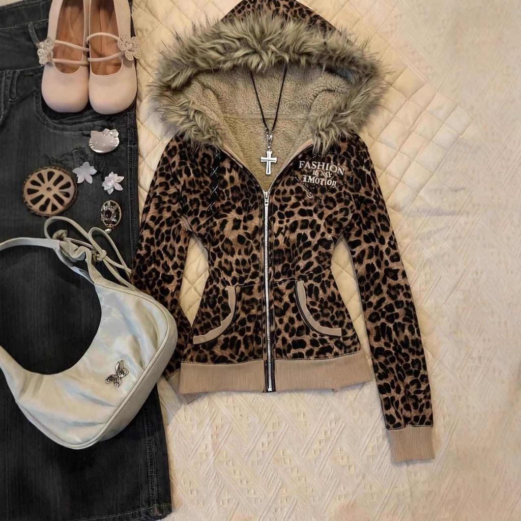 VAYLA Y2K Hot Girl Herbst Winter Harajuku Vintage Leopard Print Slim Fit Sweatshirt Damen Gothic Pelzkragen Reißverschluss Langarm Hoodie