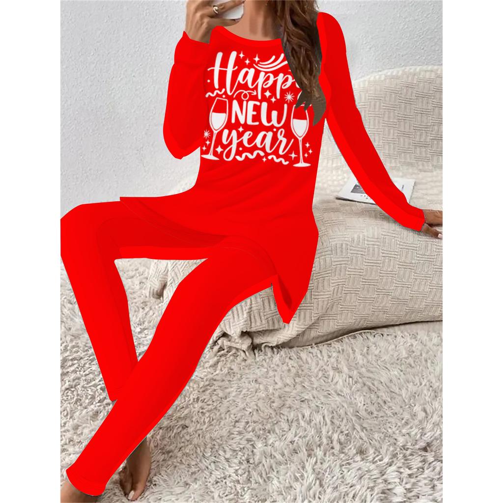 Euro-amerikanische Mode 3D Neujahrsdruck Damen Vier-Jahreszeiten Langarm-T-Shirt + Lange Hose Zweiteiliges Set. Das perfekte Geschenk für Neujahr