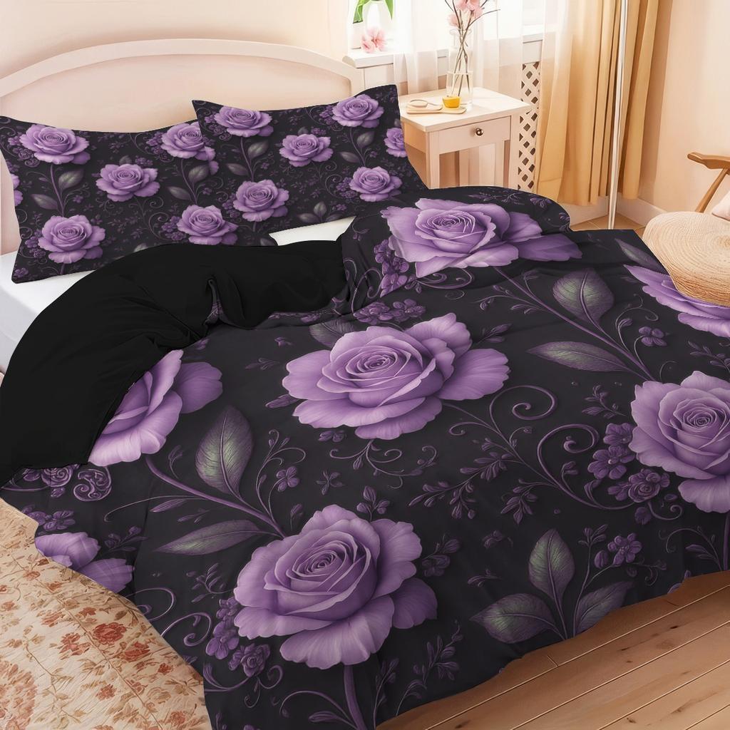 3Pcs Purple Rose Heart Patterned Duvet Cover Set, 1 Duvet Cover+2 Pillowcases, Coreless. Soft And Comfortable Bedding Set