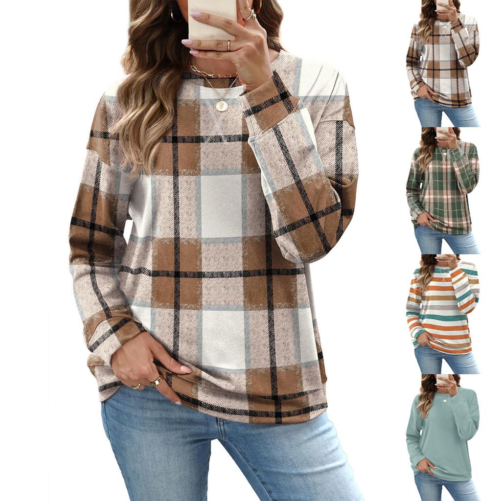 Damen Lockeres Kariertes Pullover-Sweatshirt, Lange Ärmel, Hals-Top