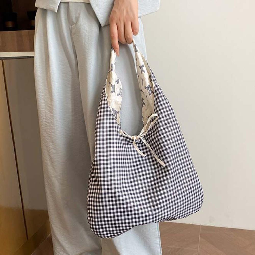 Sweet Plaid Nylon Vest Pouch Lace Decoration Tote Bag Simple Women Bow Printed Handbag Storage