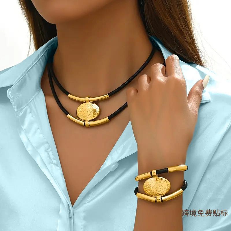 Bohemian Black Silver Oval Pendant Necklace Bracelet Set Creative Versatile Ladies Jewelry Set