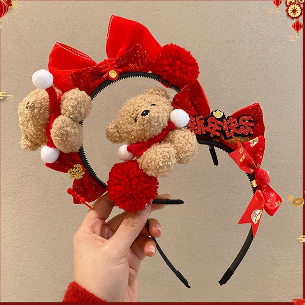 Red New Year Headband Cartoon Plush Hair Hoop Creative Red Velvet Bow Hairband New Year Headpiece