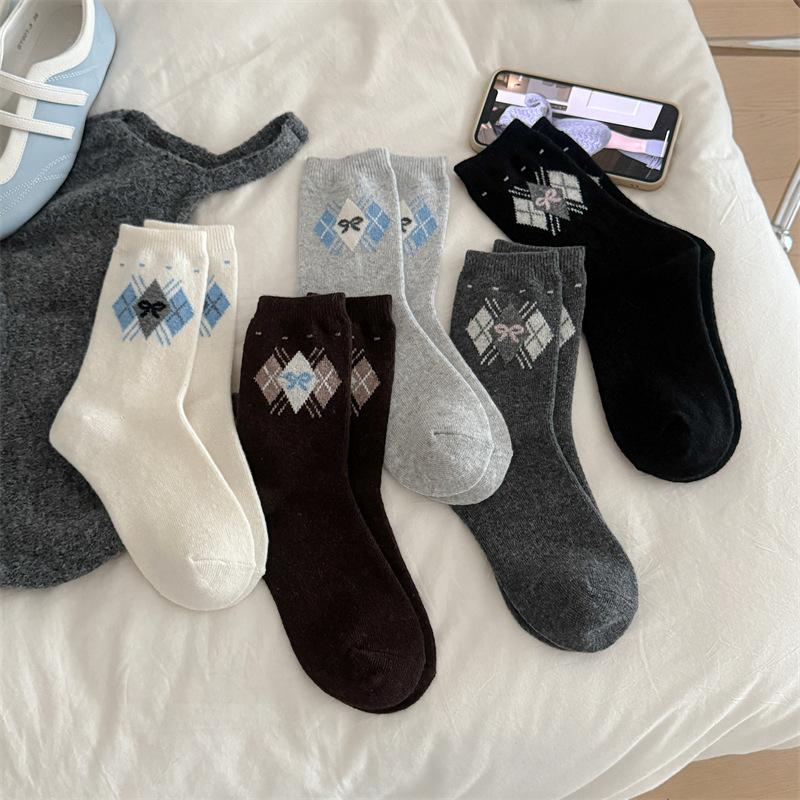 Rhombus Plaid Bow Wool Socks Children'S Wind Thickened Warm Retro Stacking Socks