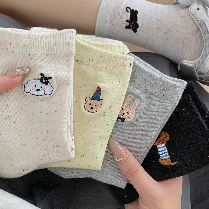 Autumn Ab Side Embroidery Animal Bow Cartoon Cotton Socks Dot Gauze Pile Socks Women'S Socks