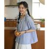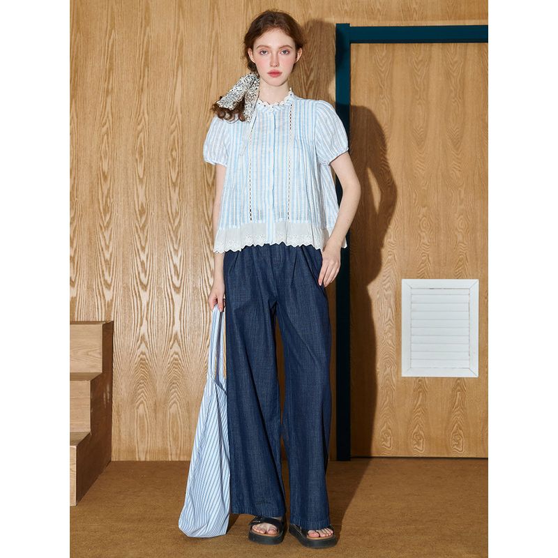 Coolhut Pleated Lace Patchwork Striped Hollow Puff Sleeve Short-Sleeved Shirt with a Youthful and Elegant Look for Women in Summer 2025