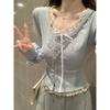 Spitzen-Patchwork Süßes Fake-Zweiteiler Langarm-T-Shirt für Damen Herbst Koreanischer Stil Reines Verlangen Einreiher Oberteil
