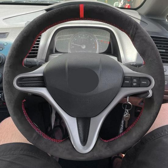 Black+Red Steering Wheel Leather Cover For Honda Civic 8th MK8 2005 - 2011 SUEDE