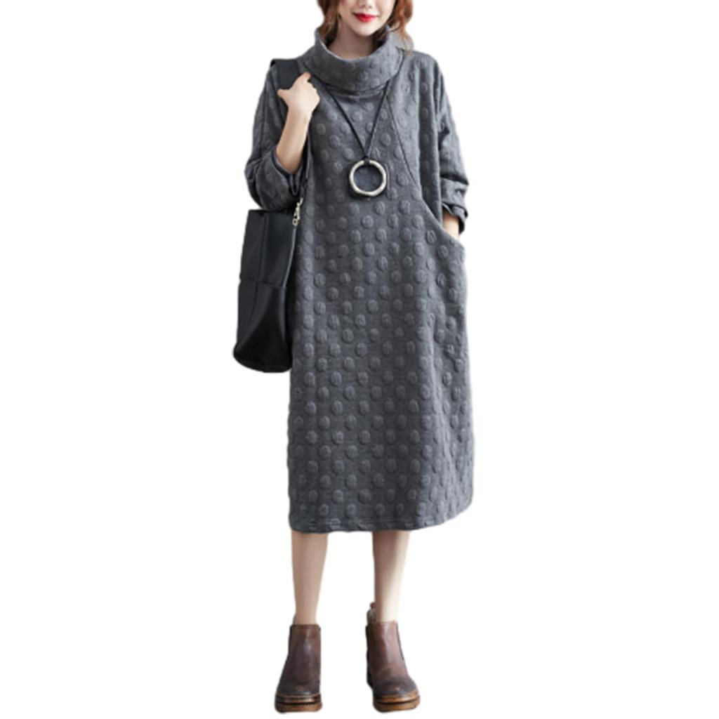 Kapuzenpullover Lang Hoch Gepunktet Retro mit Plus Elegant Maxi Lässig Locker Alltag Winter [CCGGOWMM] Damenkleid, Ärmel, Hals, Muster, Stil, Taschen,