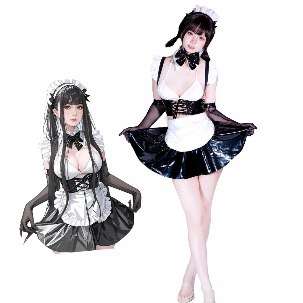 SENMHS Sexy Maid Cosplay PU Moe Moe Black Bow Mini and 2 Costume, Leather, Moe, Devilish, Alluring, Cute, Bold, Lingerie, Bodycon, Enamel, Women's